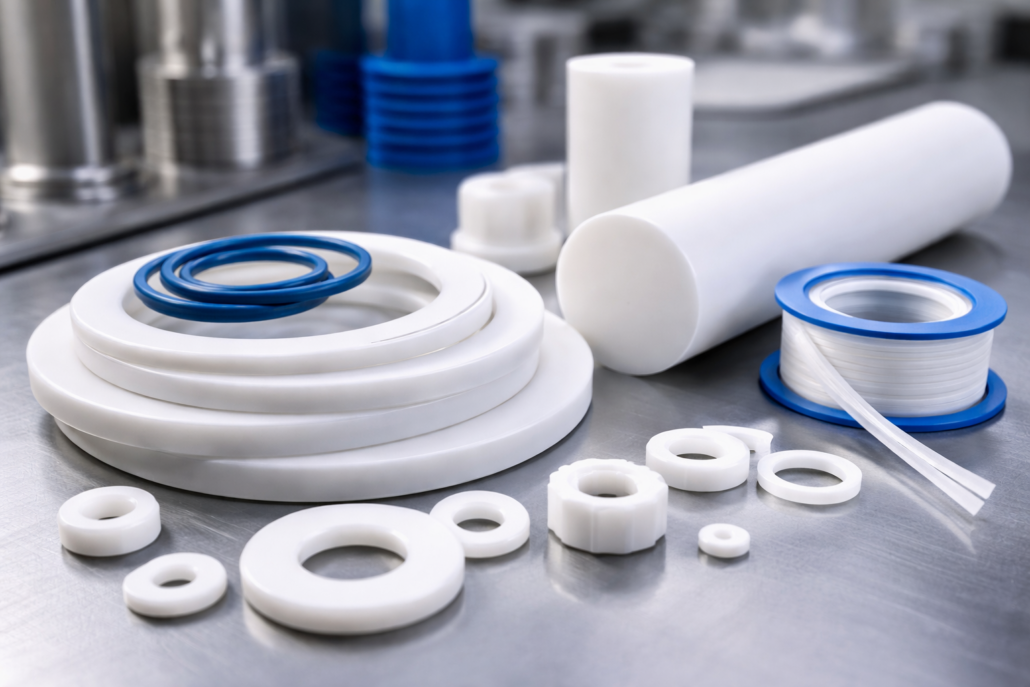 El PTFE se utiliza para fabricar juntas industriales, arandelas técnicas, piezas mecanizadas y componentes de baja fricción en sectores como la industria química, alimentaria, farmacéutica y maquinaria industrial.